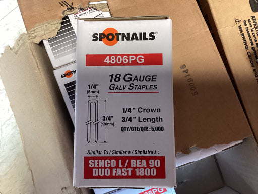 ABM Distributing, IncSPOTNAILS 1/4" x 3/4" NARROW CROWN NAILS 18 GA 5,000 pcs Spotnails 4806PG 18 Gauge 1/4" Crown 3/4 Length Galvanized L Series Staples (5M)
